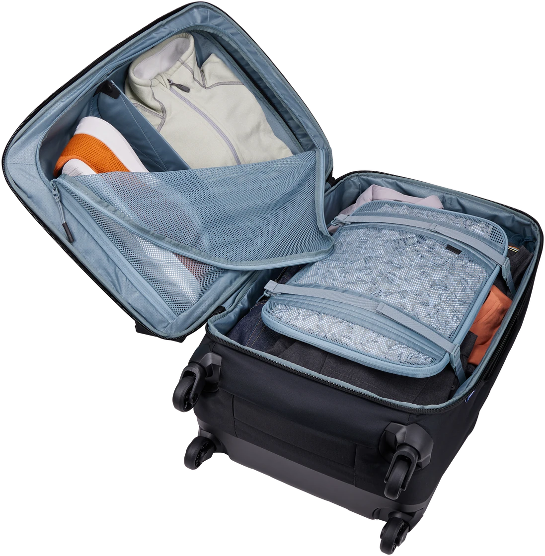 Чтобы взять с собой много вещей, не обязательно использовать большую сумку — зачастую для этого достаточно иметь компактную сумку с продуманной конструкцией. В этом чемодане с вращающимися колесами для регистрируемого багажа предусмотрена съемная компрессионная панель, которая сжимает и фиксирует одежду и другие вещи, освобождая пространство внутри. При необходимости ее также можно снять и использовать в других чемоданах. Складная перегородка в передней панели позволяет разделить содержимое (например, отделить обувь от одежды) или просто аккуратно сложить вещи.