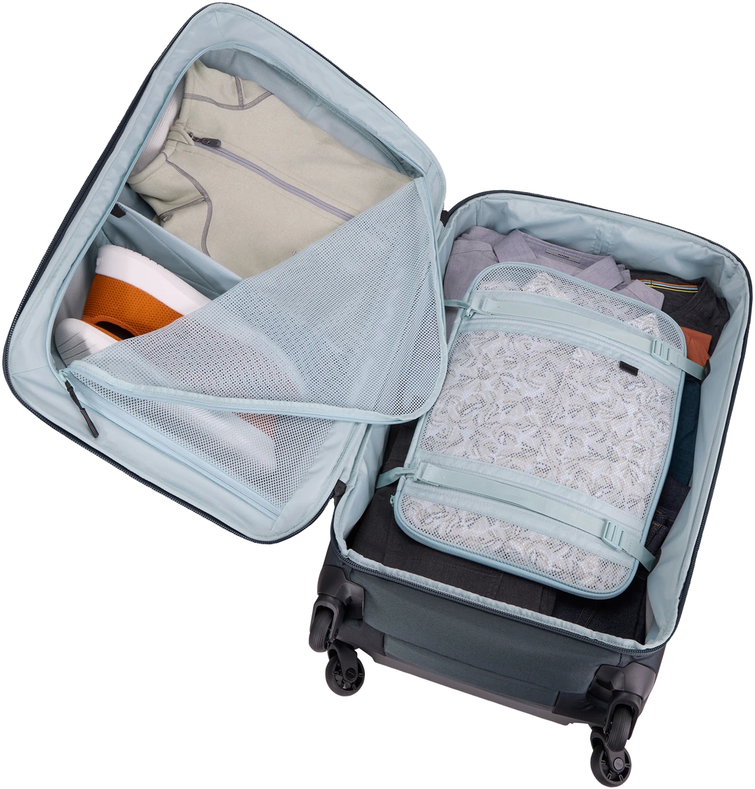 Чтобы взять с собой много вещей, не обязательно использовать большую сумку — зачастую для этого достаточно иметь компактную сумку с продуманной конструкцией. В этом чемодане с вращающимися колесами для регистрируемого багажа предусмотрена съемная компрессионная панель, которая сжимает и фиксирует одежду и другие вещи, освобождая пространство внутри. При необходимости ее также можно снять и использовать в других чемоданах. Складная перегородка в передней панели позволяет разделить содержимое (например, отделить обувь от одежды) или просто аккуратно сложить вещи.